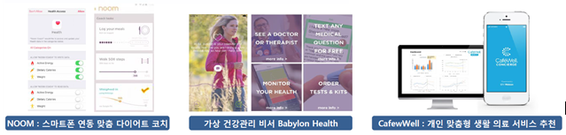 - Cafewell(美)은 웨어러블 기기와 개인 의료정보를 기반으로 IBM Watson을 활용하여 건강관리 프로그램, 병원 정보 등을 추천