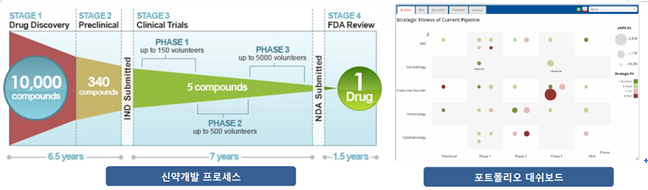 - 예측모델 사용하여 성공 가능성 높은 신약 후보 물질 추천 - 성공가능성, 비용 등에 대한 시뮬레이션을 통해 포트폴리오 관리 |
