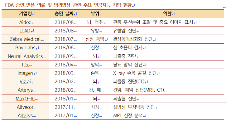 ◯ 의료 및 병리영상 인공지능 의료기기란 의료영상장비에서 생성된 영상을 이용하여 진단, 치료방법 선택, 예후 예측할 수 있는 인공지능 의료기기를 말함. 아래는 2018년 11월 기준 FDA 승인을 받은 의료 및 병리영상 관련 주요 인공지능 의료기기 현황입니다.