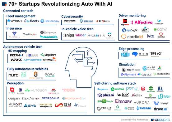 ◯ CB Insight에서 발표한 ‘70+ Startups Revolutionizing Auto with AI’에 의하면 Connected car tech 분야, Autonomous vehicle tech 분야서에 다양한 스타트업들이 인공지능 기술로 자동차 혁신을 시도하고 있습니다.