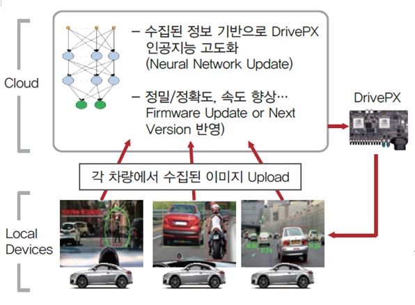 - 약 8만여 대에 이르는 자동차에서 발생된 정보가 모두 수집되면서 다양한 환경의 주행 정보를 Tesla의 인공지능이 학습합니다. 이렇게 학습된 지능을 기반으로 Tesla의 Autopilot는 시간이 지날수록 기능이 고도화되고, 발전된 기능은 다시 통신망을 통해 기존 차량에 소프트웨어 업데이트 형식으로 반영됩니다. 즉 Tesla의 자율주행 기능은 차량이 주행을 하면 할수록 기능이 점점 진화됩니다.