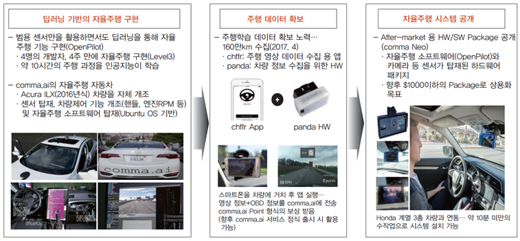 ◯ 물론 구글과 comma.ai가 개발한 자율주행 기능의 기술 수준 및 완성도의 차이는 크지만 딥러닝을 적용해 기존 자율주행 개발 패러다임을 혁신한 것. 최근 1~2년간 실리콘밸리를 중심으로 자율주행 기술을 개발해 낸 Startup이 빠르게 출현하고 있으며 이들은 대부분 딥러닝을 핵심으로 활용하고 있음. 즉 자율주행차 구현의 핵심이 특화 센서와 자동차 업계의 전문가에서 딥러닝 전문가와 주행 과정을 학습시킬 수 있는 데이터로 이동하고 있는 것