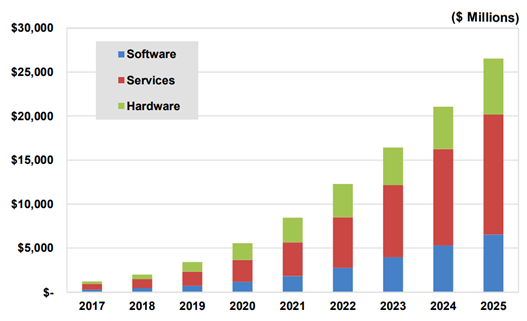 ◯ 글로벌 시장조사 기관인 트랙티카(Tractica)의 보고서에 따르면 자동차 인공지능 소프트웨어, 하드웨어 및 서비스의 매출이 2018년 20억 달러에서 2025년 265억 달러로 연평균 성장률(CAGR)은 46.9%에 달할 것으로 예측